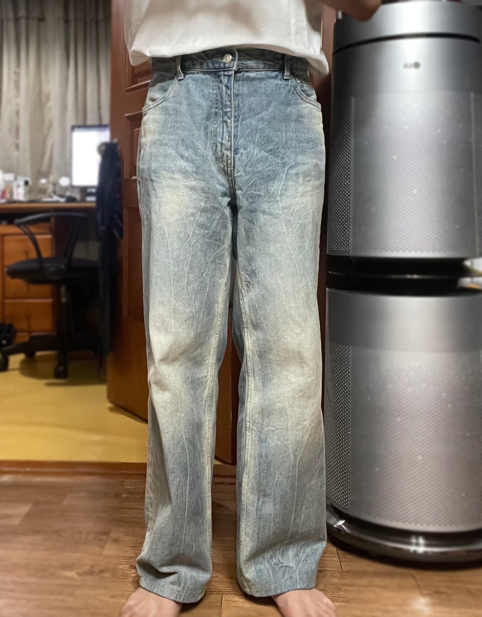 색상은 연청색상이며 밝은 옷, 어두운 옷 가리지 않고 어렵지 않게 코디를 할 수 있습니다.전반적으로 세로줄 워싱이 들어가 있어서 흔치 않은 디테일을 느낄 수 있습니다.무난한 상의와 매치해도 포인트가 되어주어서 치트키라고 할 수 있을 것 같습니다.디테일이 과하다면 과한 바지인데, 코디까지 쉽다니 더할 나위 없다고 생각합니다.